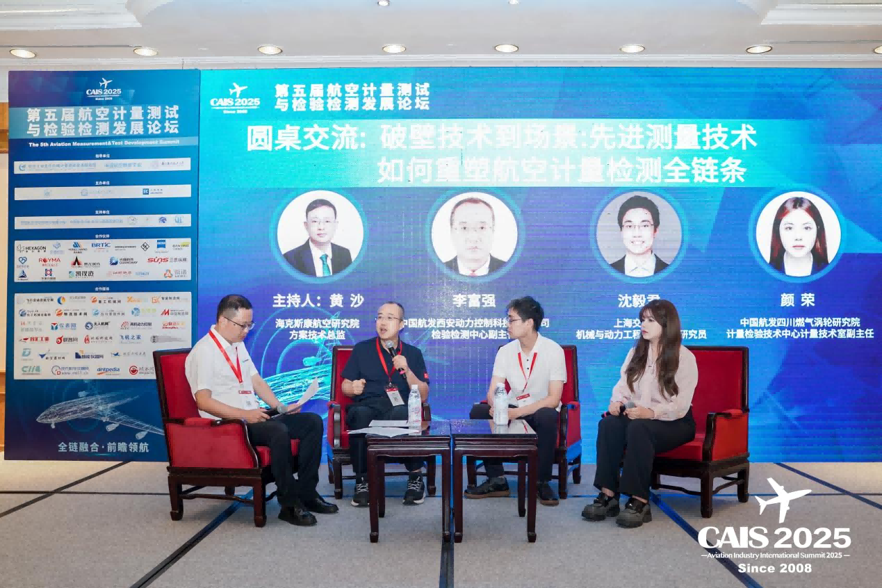 第一天大会的最后还特别安排了圆桌交流,海克斯康航空研究院方案技术总监黄沙、中国航发西安动力控制科技有限公司检验检测中心副主任李富强、上海交通大学 机械与动力工程学院助理研究员沈毅君、中国航发四川燃气涡轮研究院计量检验技术中心计量技术室副主任颜荣四位专家就“先进测量技术如何重塑航空计量检测全链条”进行了热烈讨论。这场圆桌讨论为与会者提供了一个多角度的视野,展示了不同专家如何思考和应对航空检测事业中的机遇和挑战。