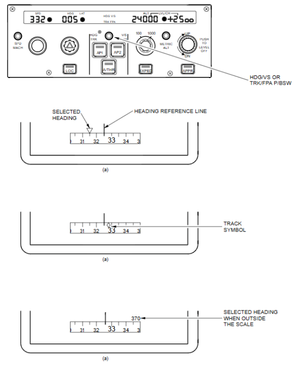 绿色菱形符号:代表飞机当前的实际航迹。青色三角形符号:代表FCU(飞行控制组件)上选择的航向或航迹(前提是FCU对应的计数器上显示了数值)。如果所选数值超出当前航向刻度的显示范围,该符号会由位于刻度盘左侧或右侧的数字替代。
