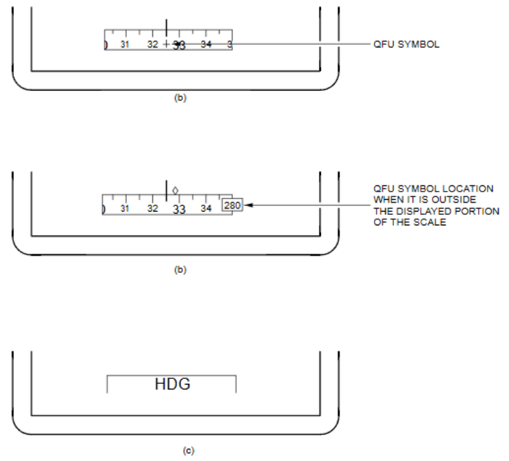 刻度由白色的基准线以及对应的航向值组成。每隔10度标注一个用小号字体书写的航向值。每隔30度的倍数(即30、60、90...)用大号字体突出显示。屏幕上可见的航向刻度范围是飞机当前磁航向的正负24度。