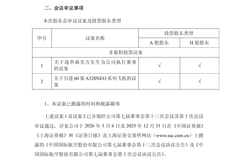 3月17日,中国国航披露2026年第一次临时股东会会议资料,公司定于3月25日(星期三)14:00点召开股东会审议《关于引进60架A320NEO系列飞机的议案》。