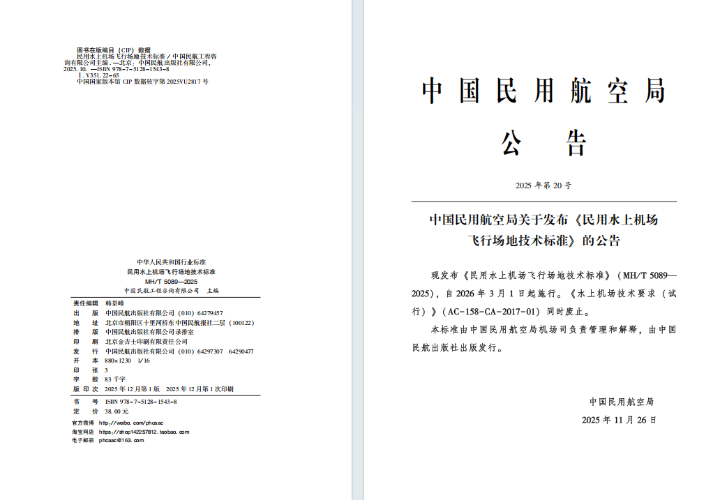 现发布《民用水上机场飞行场地技术标准》(MH/T 5089-2025),自2026年3月1日起施行。《水上机场技术要求(试行)》(AC-158-CA-2017-01)同时度止。本标准由中国民用航空局机场司负责管理和解释,由中国民航出版社出版发行。