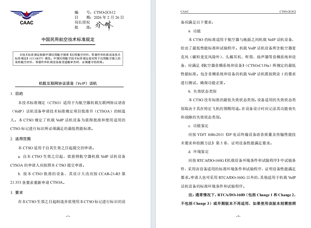 本技术标准规定(CTSO)适用于为航空器机载互联网协议语音(VoIP)话机设备申请技术标准规定项目批准书(CTSOA)的制造人。本 CTSO 规定了机载 VoIP 话机设备为获得批准和使用适用的CTSO 标记进行标识所必须满足的最低性能标准。