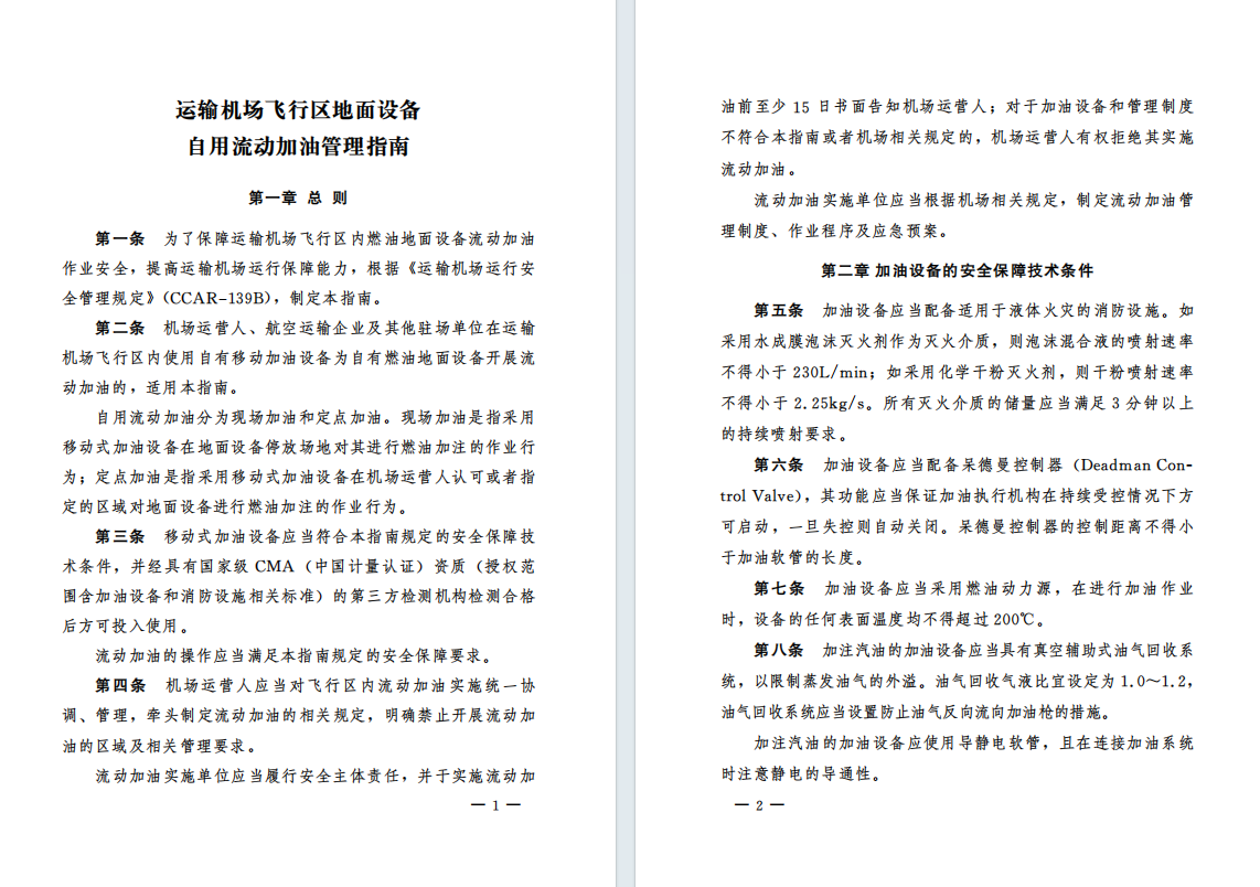 本指南依据 《运输机场运行安全管理规定》(CCAR-139B)的有关要求进行编制,旨在为运输机场飞行区内地面设备自用流动加油作业提供系统指导,确保流动加油作业安全,提升机坪运行效率和保障能力。本指南包括总则、加油设备的安全保障技术条件、加油作业操作的安全保障要求、附则,共4章。