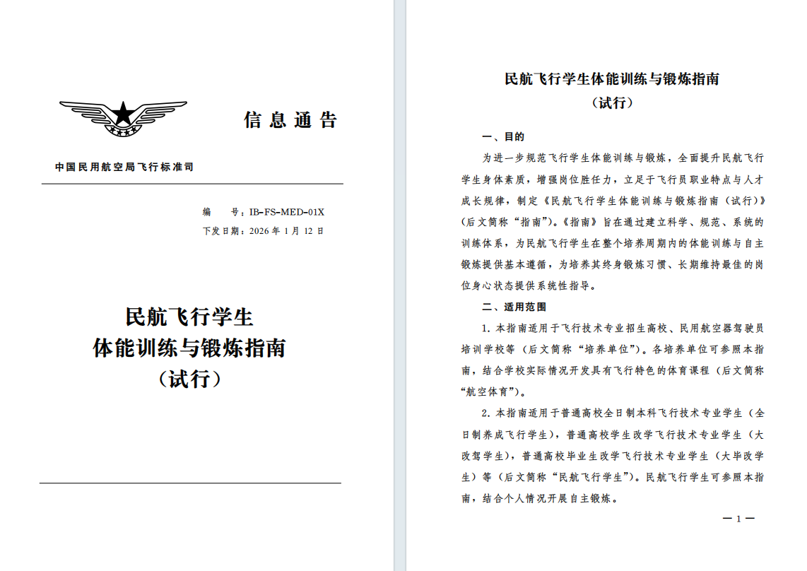 1.本指南适用于飞行技术专业招生高校、民用航空器驾驶员培训学校等 (后文简称 “培养单位”)。各培养单位可参照本指南9结合学校实际情况开发具有飞行特色的体育课程 (后文简称“航空体育”)。 2.本指南适用于普通高校全日制本科飞行技术专业学生 (全日制养成飞行学生)9普通高校学生改学飞行技术专业学生 (大改驾学生)9普通高校毕业生改学飞行技术专业学生 (大毕改学生)等 (后文简称 “民航飞行学生”)。民航飞行学生可参照本指南9结合个人情况开展自主锻炼。 本指南可作为飞行学生体能训练的指导规范9贯穿飞行学生培养全过程9亦可作为民航飞行员日常锻炼的参考。