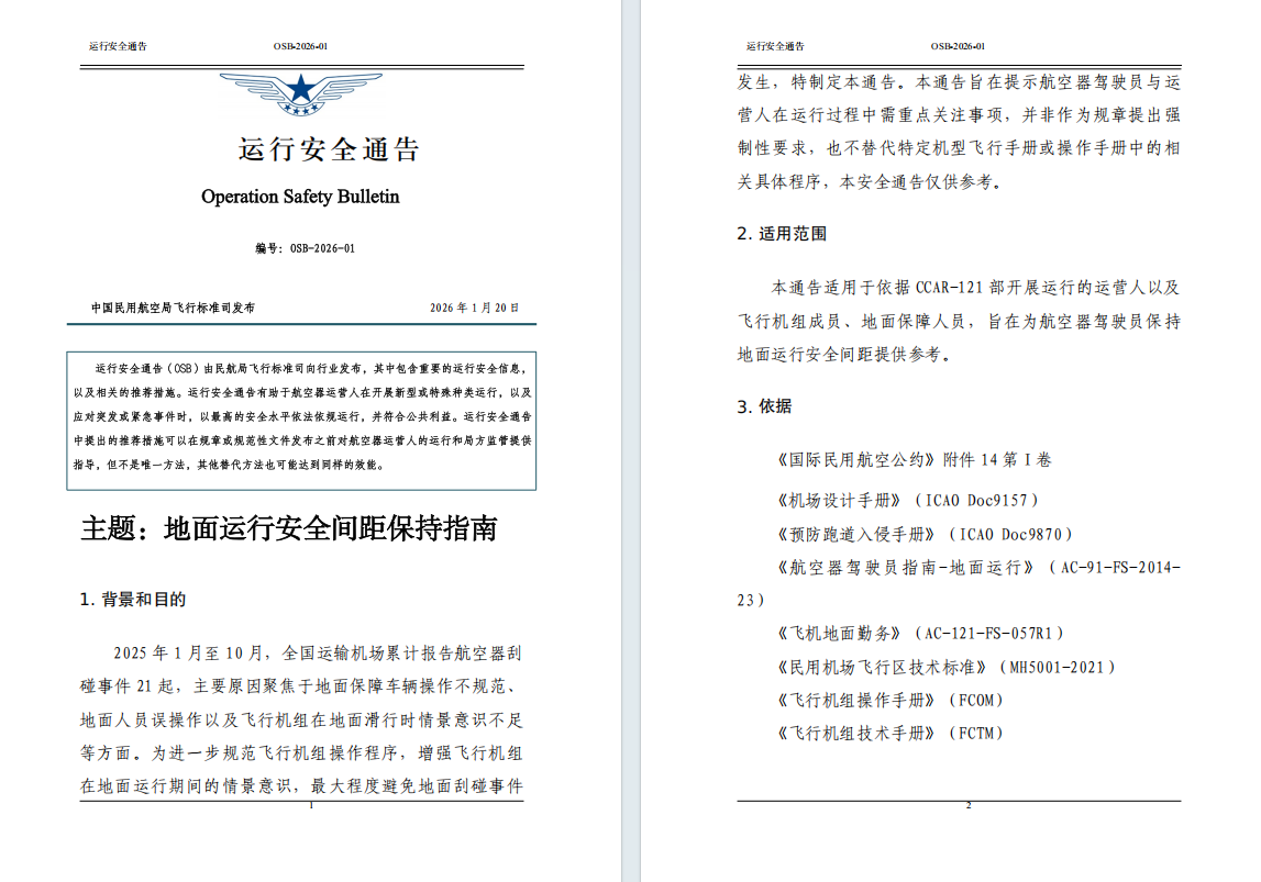 本通告适用于依据 CCAR-121 部开展运行的运营人以及飞行机组成员、地面保障人员,旨在为航空器驾驶员保持地面运行安全间距提供参考。