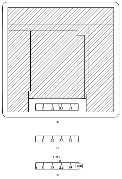 刻度由白色的基准线以及对应的航向值组成。每隔10度标注一个用小号字体书写的航向值。每隔30度的倍数(即30、60、90...)用大号字体突出显示。屏幕上可见的航向刻度范围是飞机当前磁航向的正负24度。