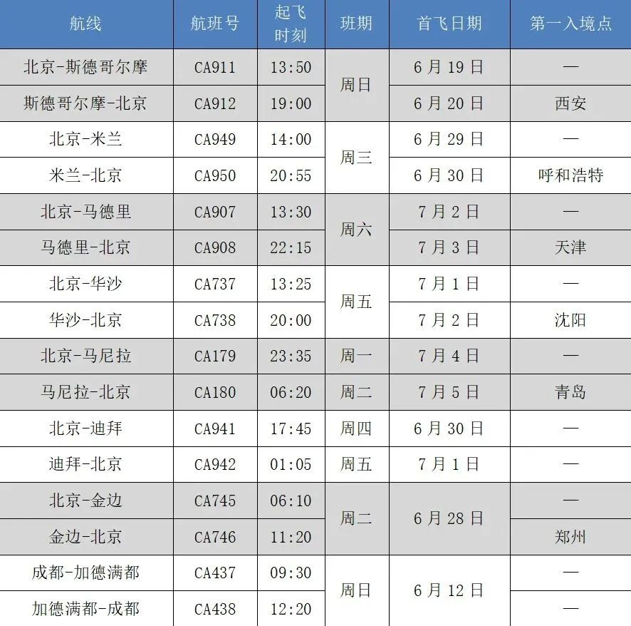 6月30日,国航发布通知,近期,国航陆续恢复多条国际航线,涉及欧洲、亚洲多个城市,每条航线每周往返执飞一班,具体信息如下: