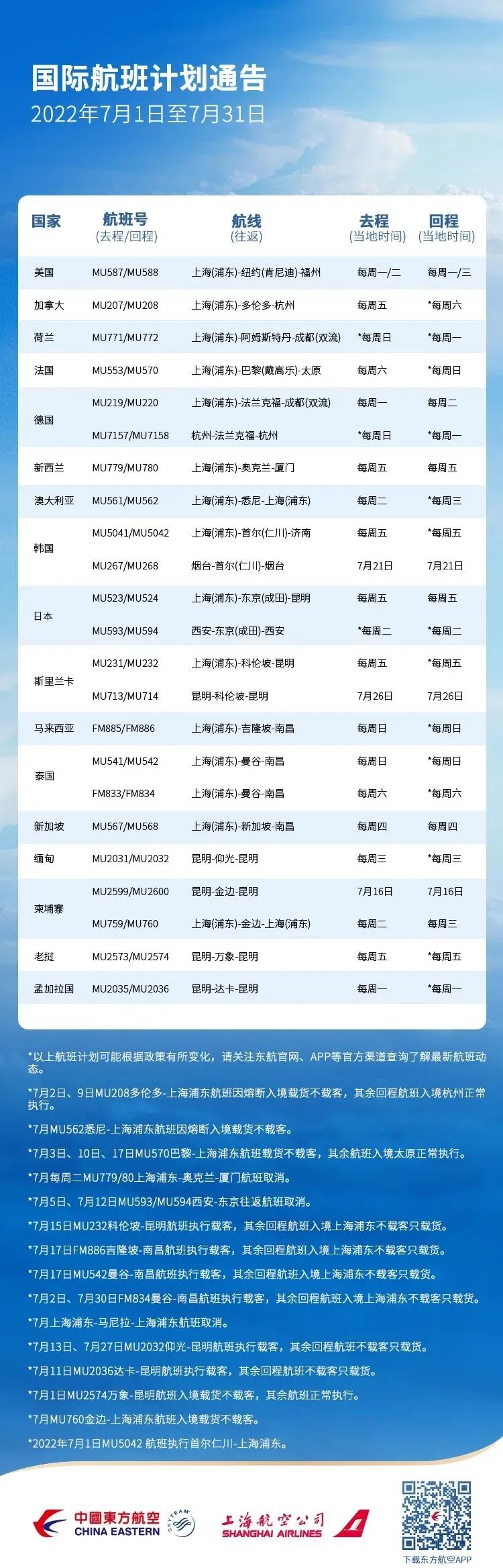 东航7月国际航班计划