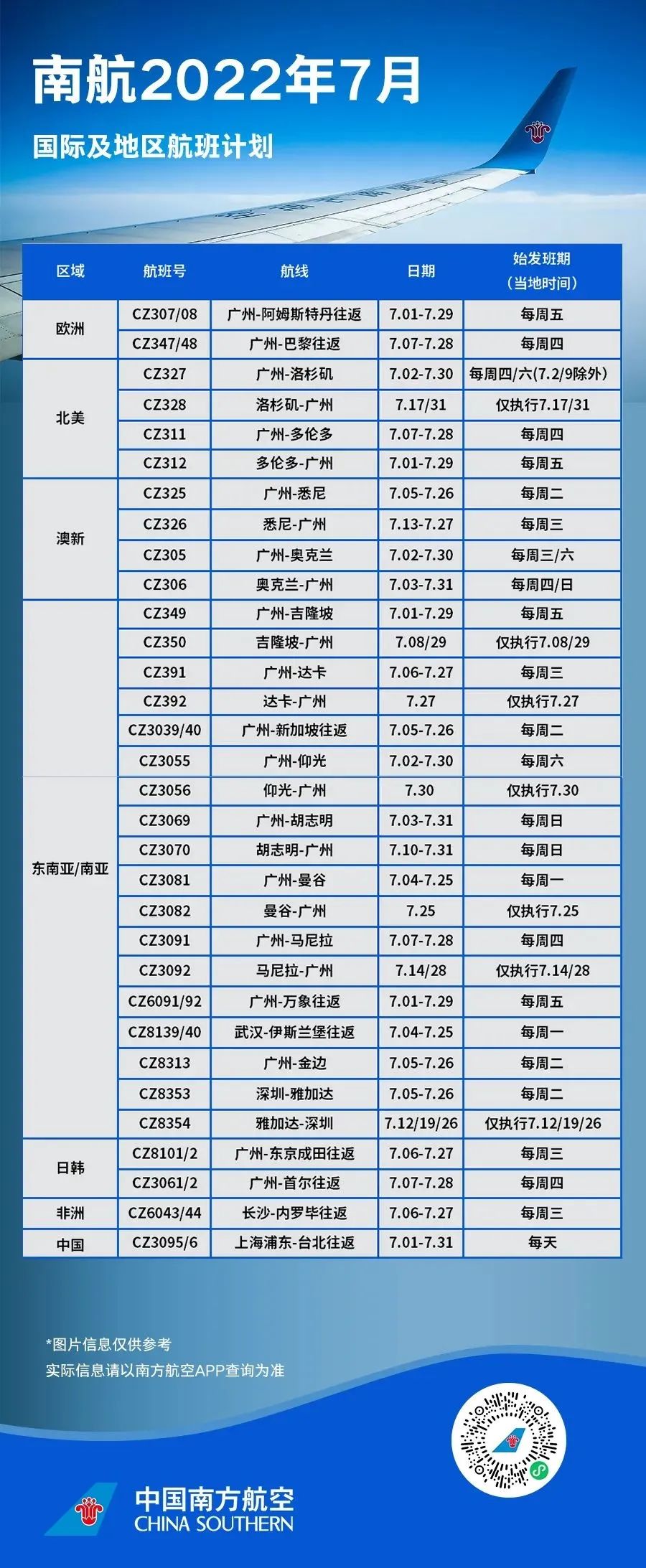 南航7月国际及地区航班计划