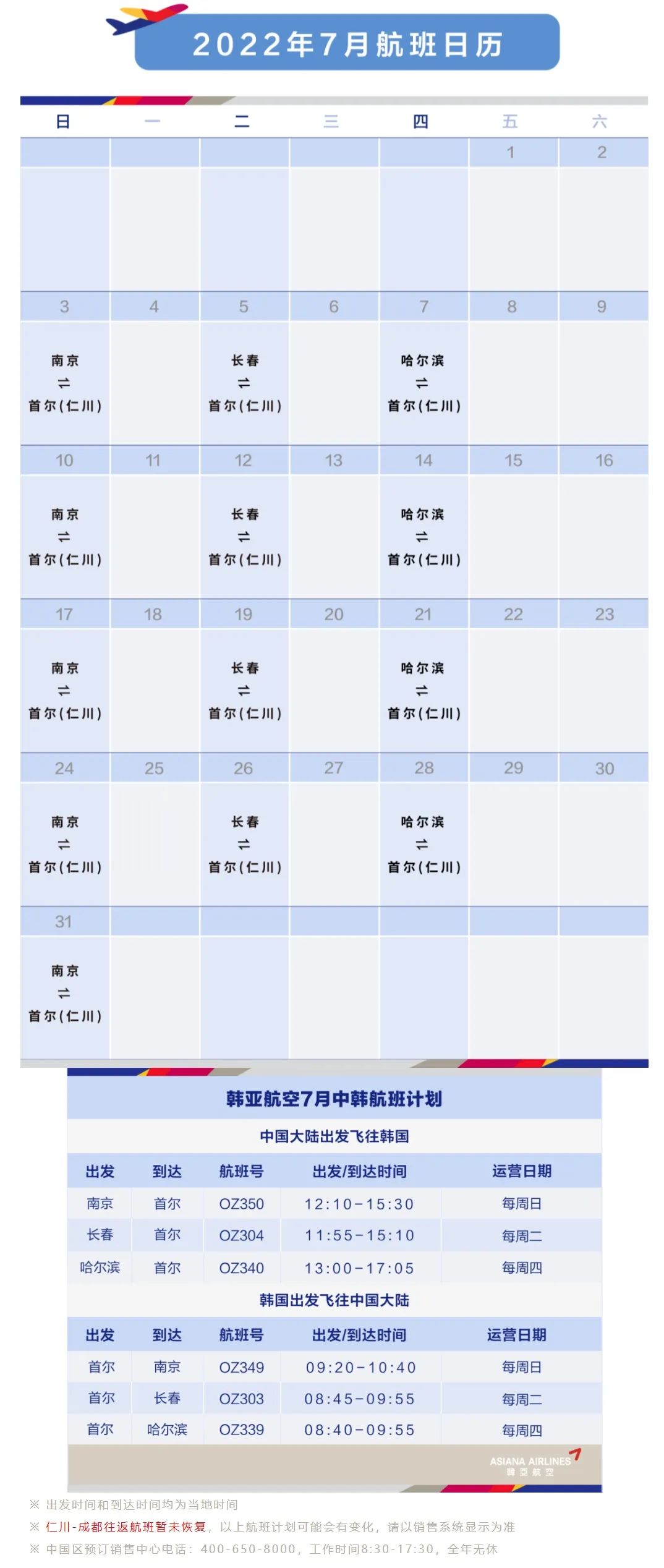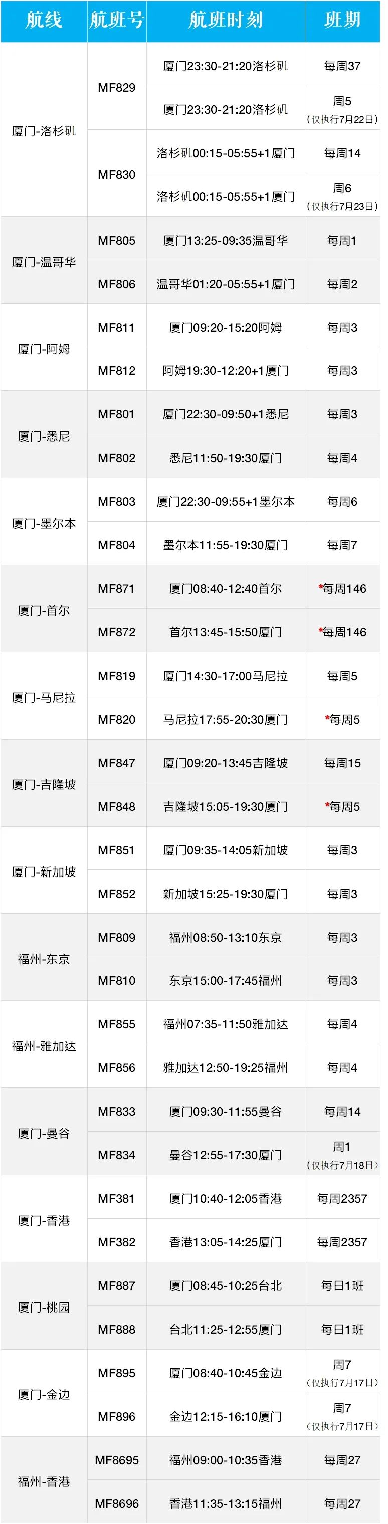 厦航2022年7月国际及地区航班计划