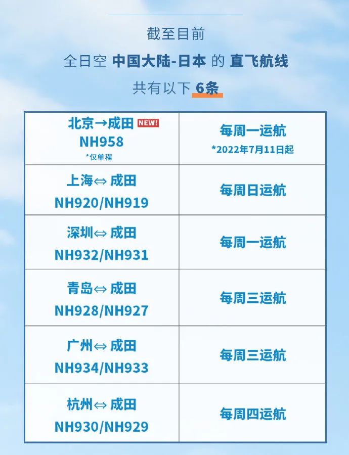 全日空将自7月11日起恢复北京至成田机场的航班。首先定为每周1班,这是全日空约2年零3个月以来首次恢复北京航线。