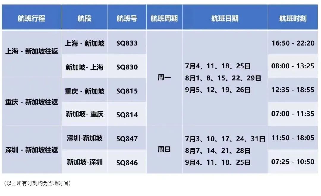 新加坡航空于22年7月1日–22年9月30日期间在中国大陆地区将运营以下航线及航班: